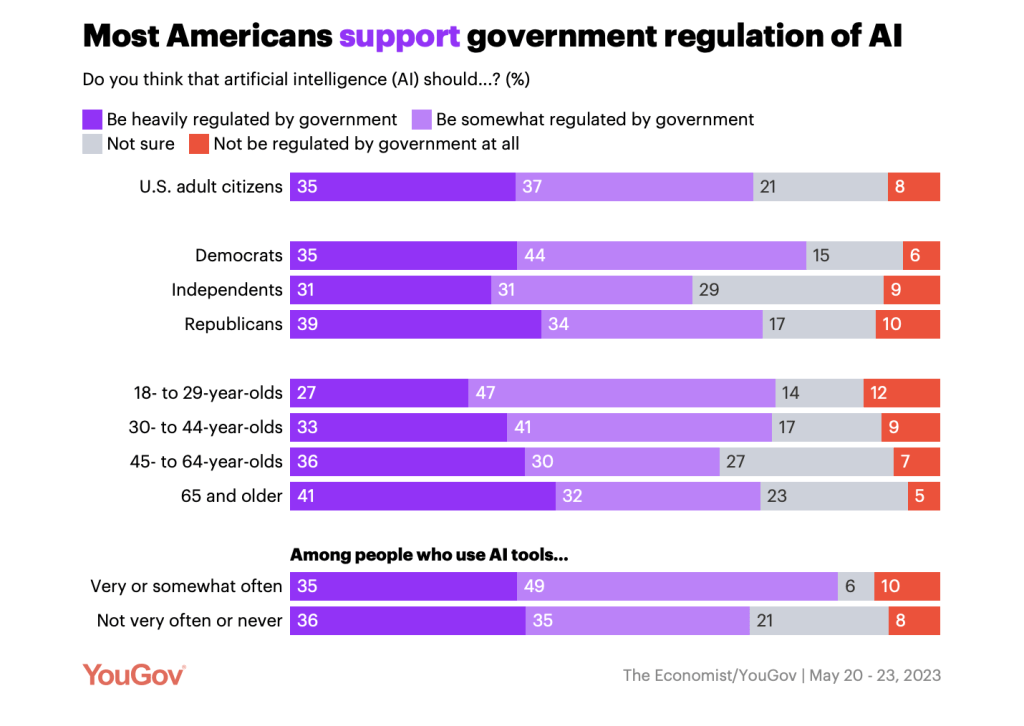 As AI technology rapidly evolves, public and private institutions continue to develop coherent policies and frameworks. At the same time, public sentiment reveals growing concerns that aren’t always reflected in the integration and use of AI. For example, in the YouGov poll on AI regulation, many U.S. citizens still believe that there should be more regulation of AI. Accordingly, policy should meet the public’s demand for proactive, growth-oriented regulation, while avoiding federal pre-emption.